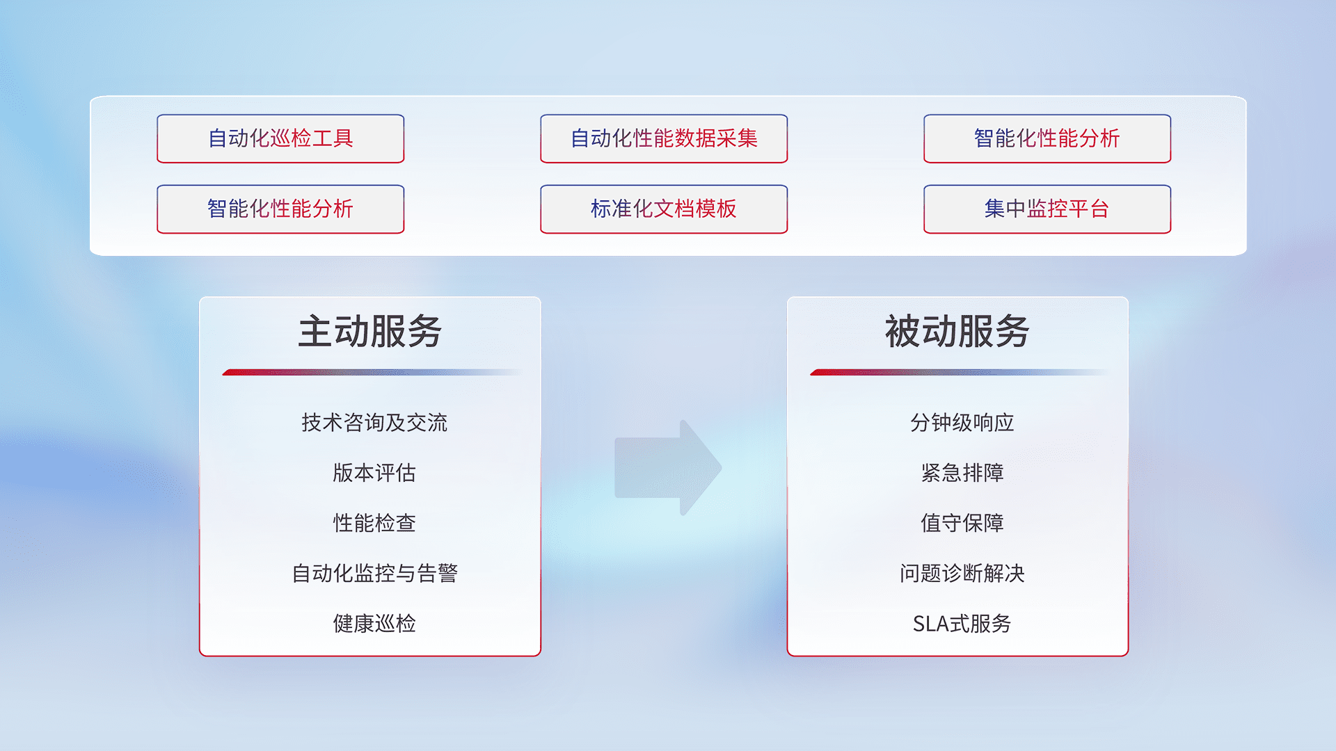 智能化工具和标准化文档,,,,保障服务质量,,提供主动服务(包含技术咨询、、、版本评估、、、、性能检查、、自动化监控与告警、、、健康巡检)和被动服务包含(分钟级响应、、紧急排障、、值守保障、、、、问题诊断解决、、、SLA服务)。。。